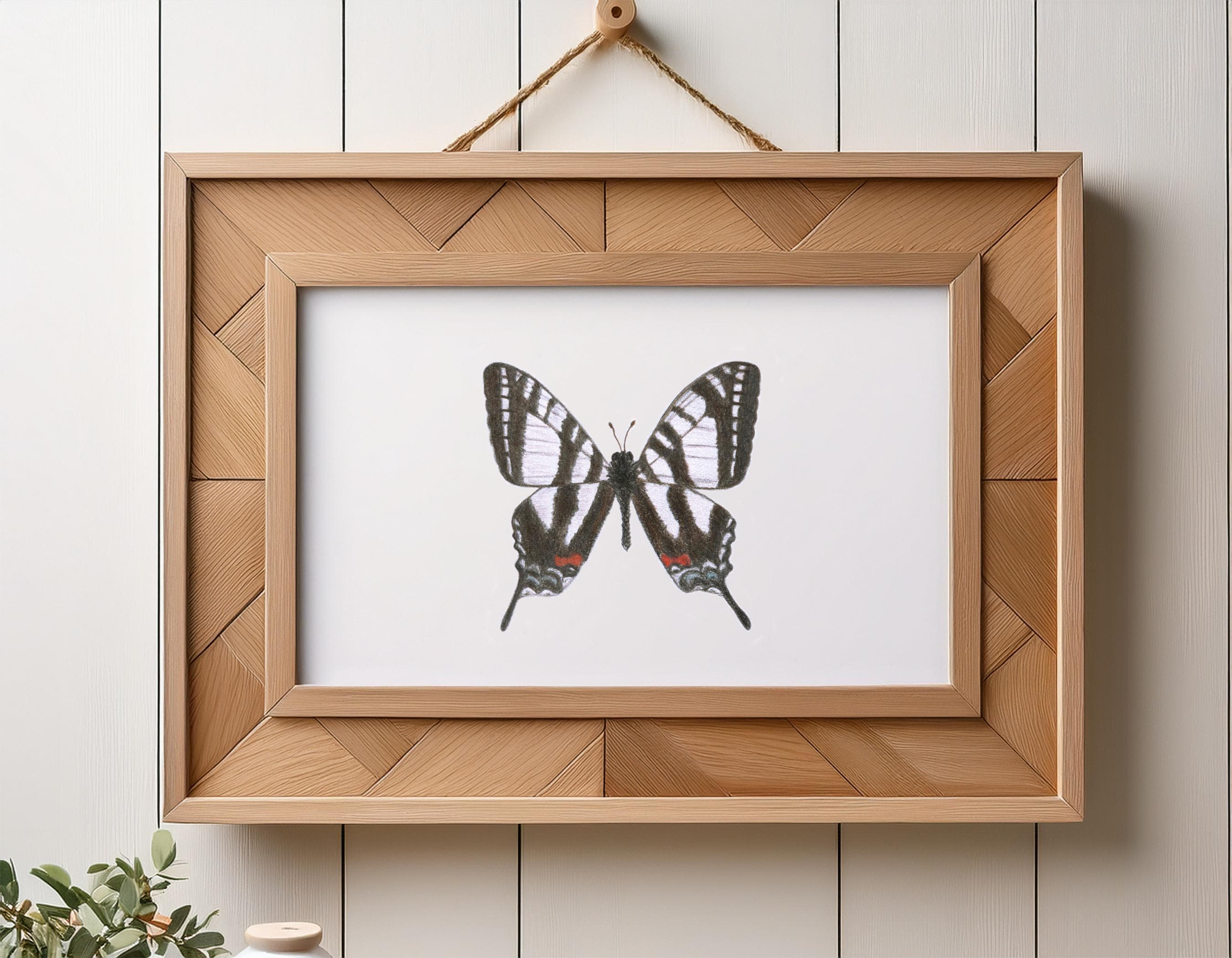 This hand-drawn art print features the Zebra Swallowtail (Eurytides marcellus), a butterfly known for its bold black-and-white stripes and signature long, tail-like wings. Native to the eastern United States and often seen fluttering near pawpaw trees, the Zebra Swallowtail is admired for both its striking appearance and delicate form.