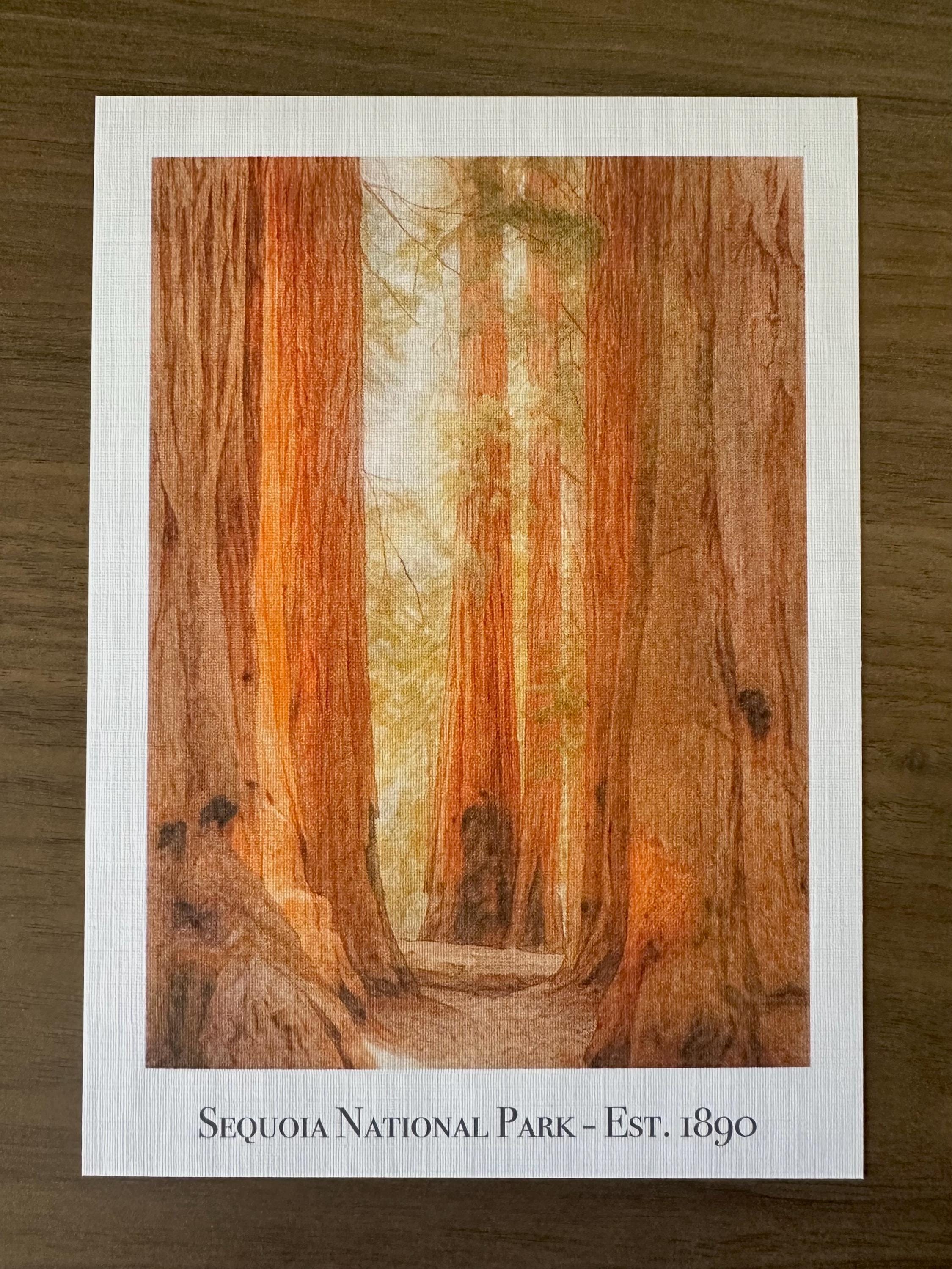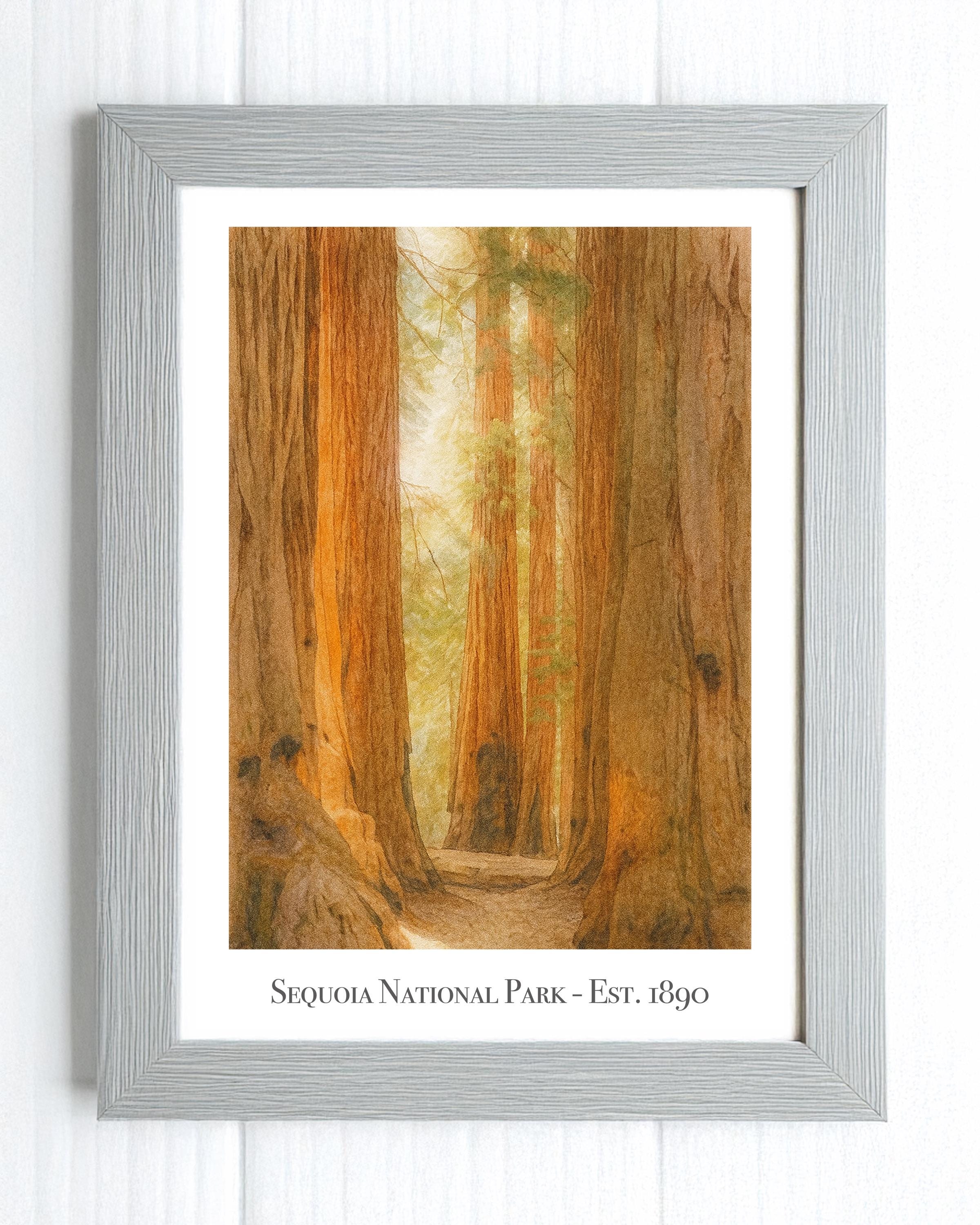 Bring the majesty of towering giants into your home with this Sequoia National Park watercolor-style art print. Perfect for National Park lovers, hikers, and anyone who appreciates the beauty of the the great outdoors.