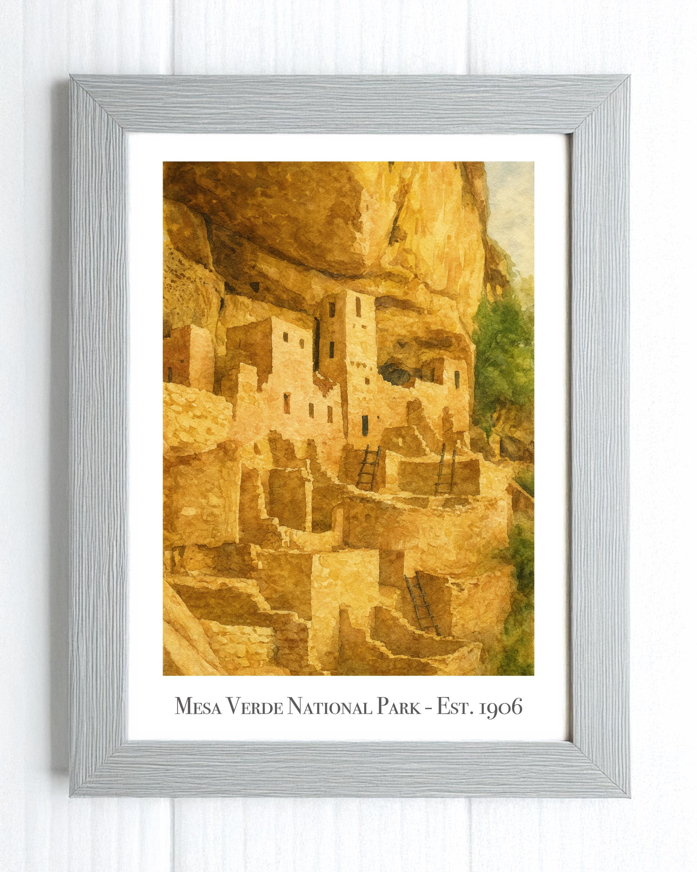 Celebrate the rich history and beauty of the Southwest with this Mesa Verde National Park watercolor-style art print. Perfect for National Park lovers, hikers, and anyone who appreciates America’s most extraordinary heritage sites.