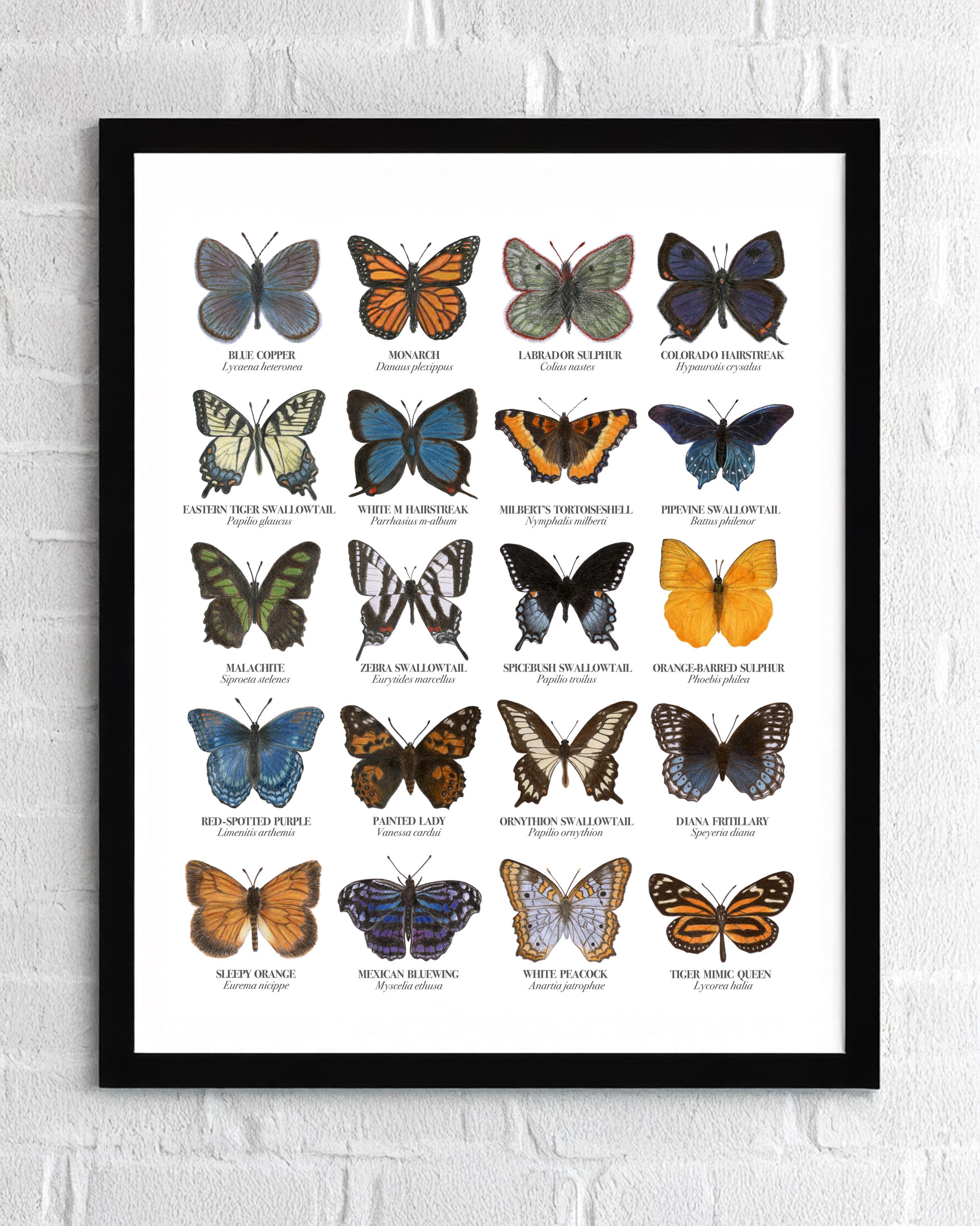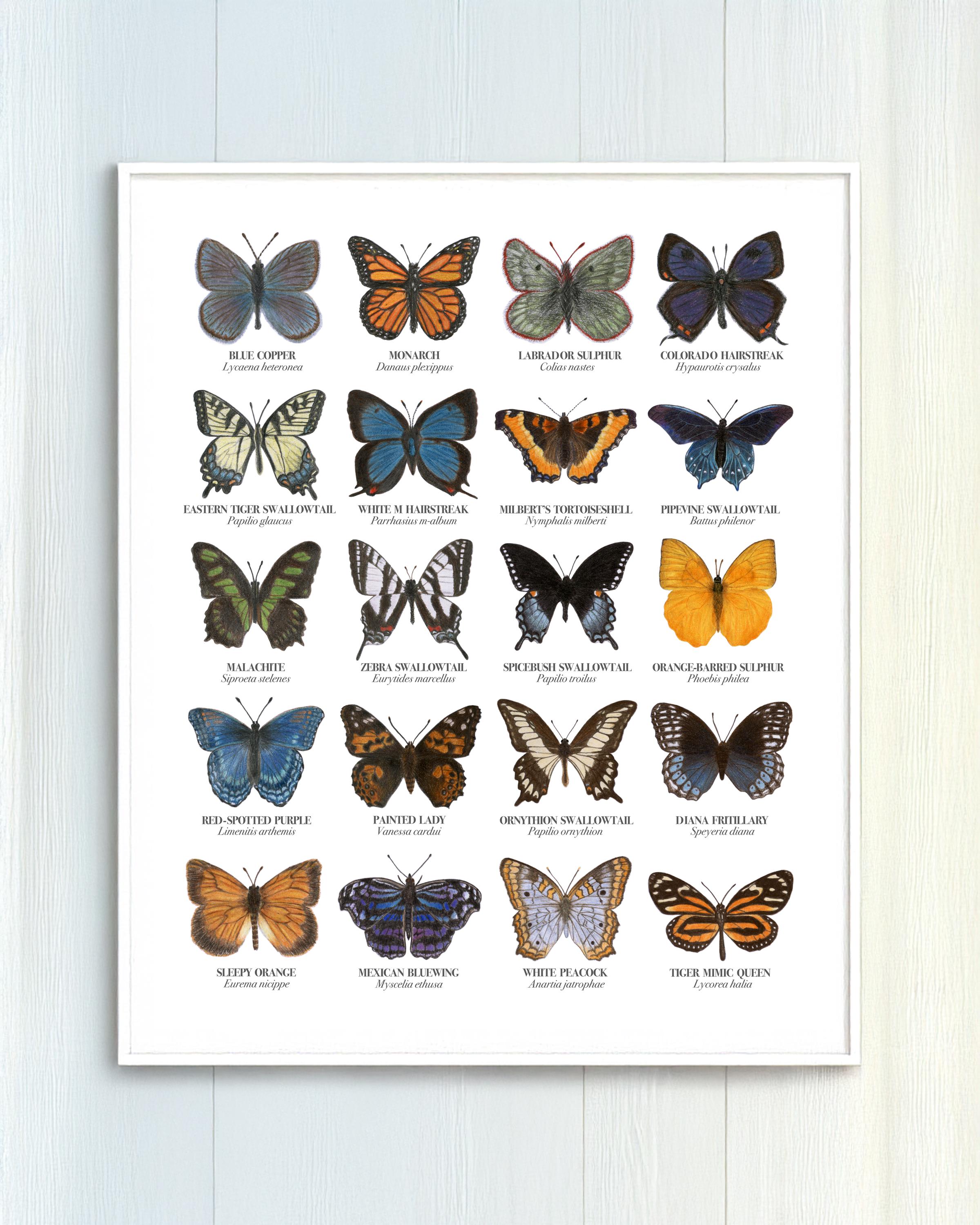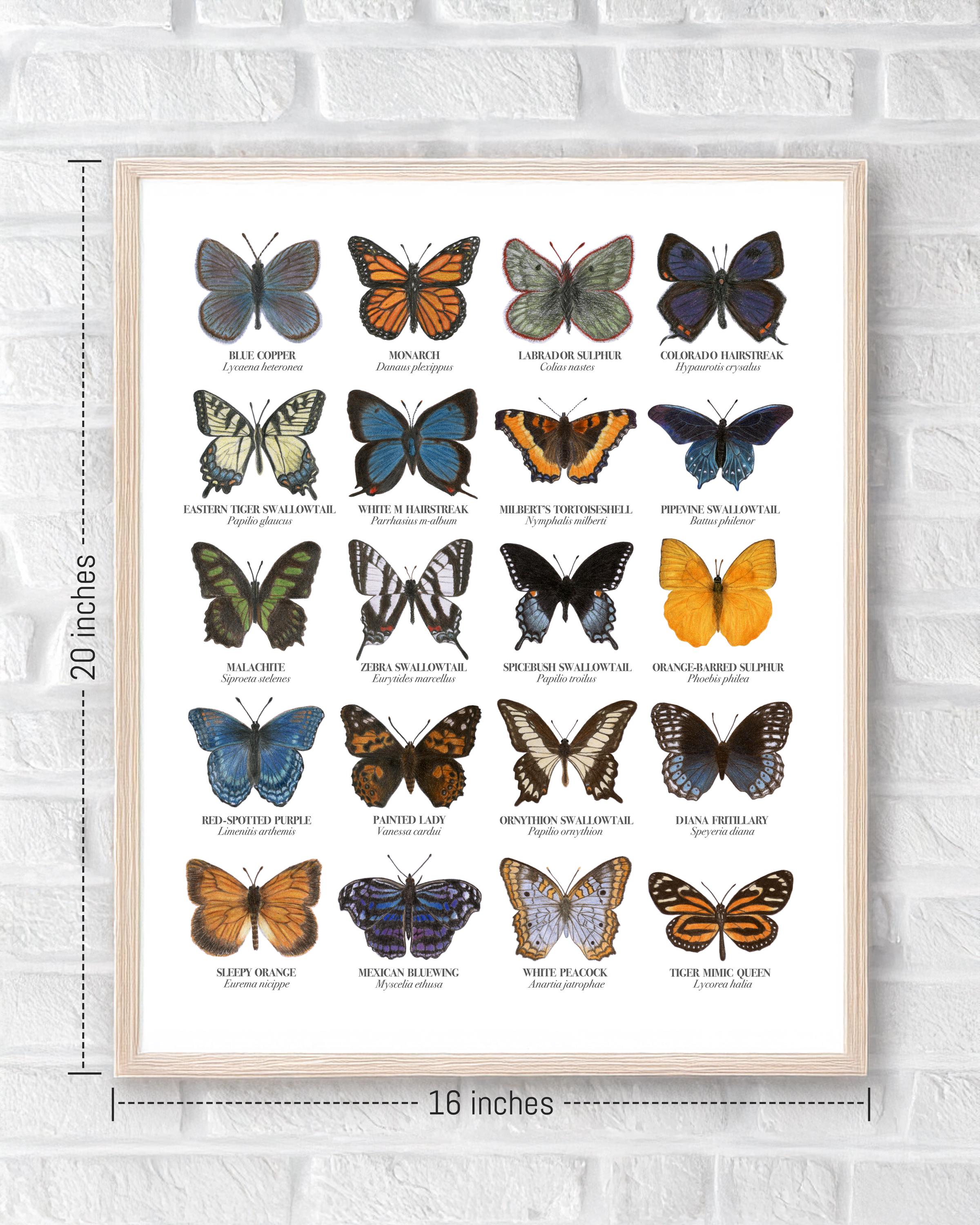 Celebrate the beauty of butterflies with this vibrant, hand-illustrated Butterfly Species Identification Poster. Featuring 20 unique species—including the Monarch, Eastern Tiger Swallowtail, and Zebra Swallowtail—each butterfly is carefully drawn with attention to detail and labeled with both its common and scientific names.